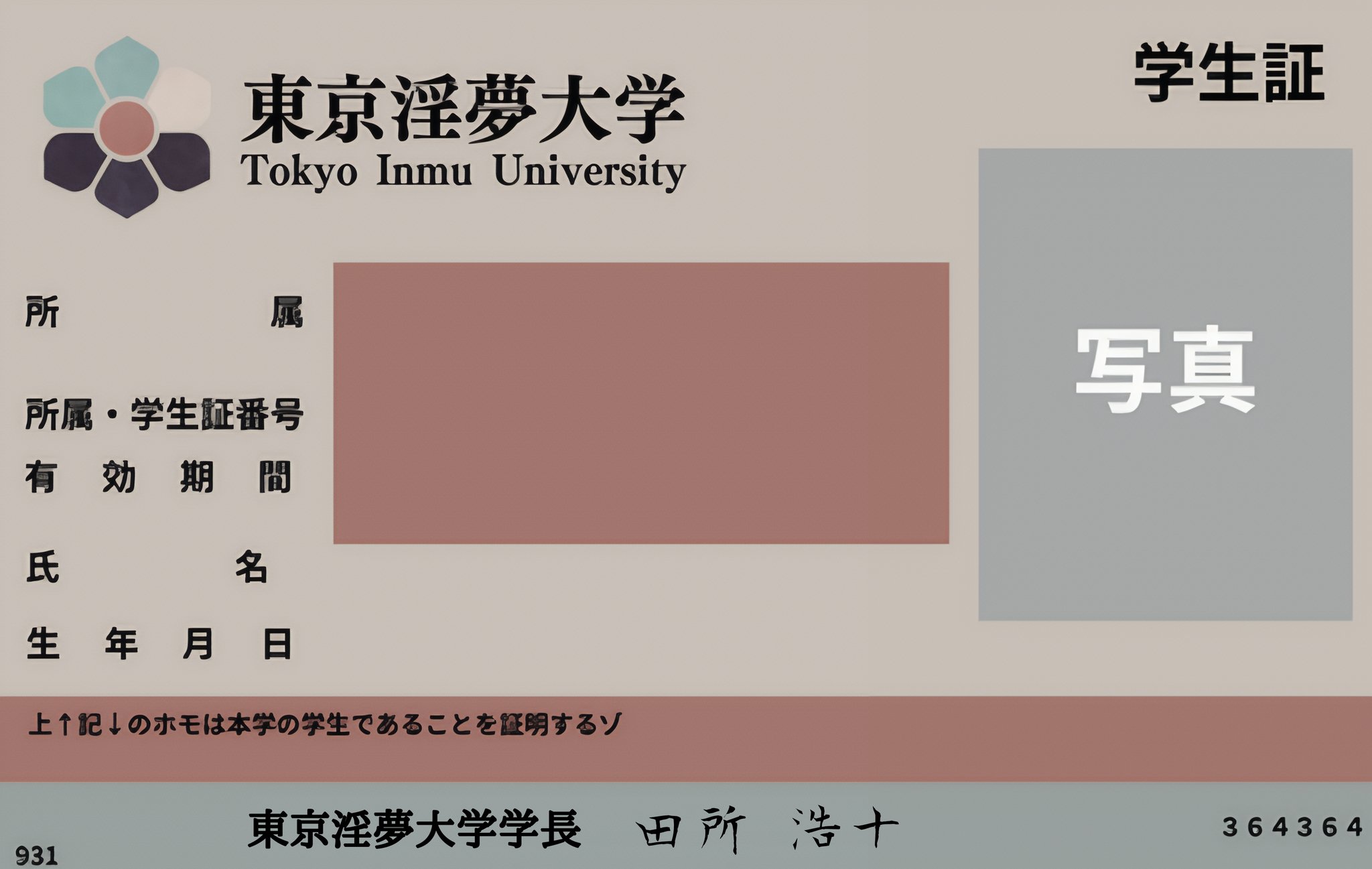 ホーム 東京淫夢大学は、1919年に設立された国↑公↓立大学である。東京都下北沢キャンパスに本部を置いているほか、泉南イオンキャンパスや岡山の県北キャンパスなどがある。学部は野獣医学部を含めて9学部あり、学生数は7676人(学部生)。QS世界大学ランキングは81位、淫夢学を扱う最高峰の学術機関として、国内外から非常に高い評価を受けている。毎年8月10日には下北沢キャンパスにて野獣祭が行われ、多くの観光客で賑わっている。 【重要】本学の略称について 本学の正式名称は「東京淫夢大学」ですが、インターネット上において、本学の略称の表記揺れが散見される状況が確認されております。以下のものは全て本学を指すものですのですので、ご注意ください。淫夢大学、淫大、下北沢大学、野獣大学、東京野獣大学、淫夢迫真大学、インム大学、ゲイ大、イキスギ大学 学生証のデザイン決定! 本学の学生証の新デザインが決定しました!東京淫夢大学らしい、ポップな色合いがすごく印象的な学生証となっております。新入生にはもうすでに配送してありますが、本学が財政難であるため在校生の皆様は電子版で我慢をお願いいたします。右の画像をダウンロードし、編集アプリなどで加工をしてください。東京淫夢大学の学生であることをアピールすることを目的に、SNSなどにアップロードをするような行為も積極的に行ってください。 学長挨拶 皆さんこんにちは。9代目東京淫夢大学総長の田所浩十です。大学は、多様な価値観や背景を持つ人々が集い、ともに知を深めていく場です。そしてその根底には、互いの人格と尊厳を尊重する姿勢が常にあるべきです。しかし、時には自分の言動が相手を傷つけてしまうこともあります。そうした事態を防ぐため、本学ではハラスメントの防止に一層力を入れていくことをここに宣言します。教室でも、研究室でも、そして日々の生活の中でも、相手の立場に目を向け、思いやりを持って接すること。それが本学の目指す姿です。互いに敬意を払い、自由に意見を述べることのできる風土を育むことによって、誰もが安心して過ごせる大学をともに実現していきましょう。 インムトピックス お知らせ 本学からの連絡事項についてはこちら 本学について 本学の成り立ちや概要についてはこちら 過去問 2027年度の受験を考えている方はこちら 2026年度入試過去問はこちら